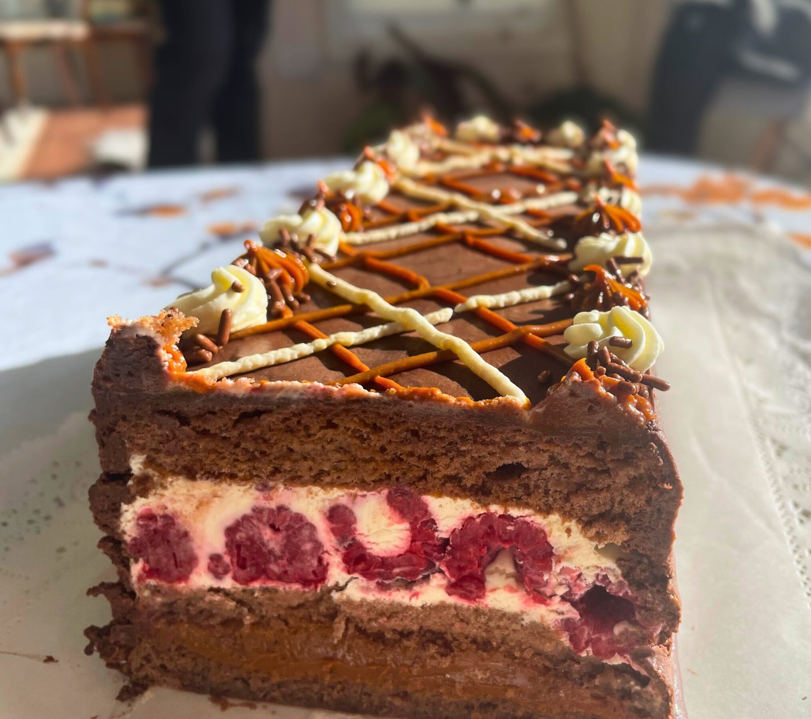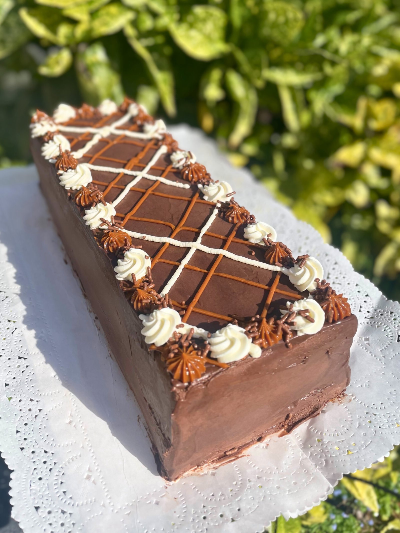 Torta de bizcochos de chocolate, rellena con una capa de manjar, frutilla o frambuesas con crema chantilly.